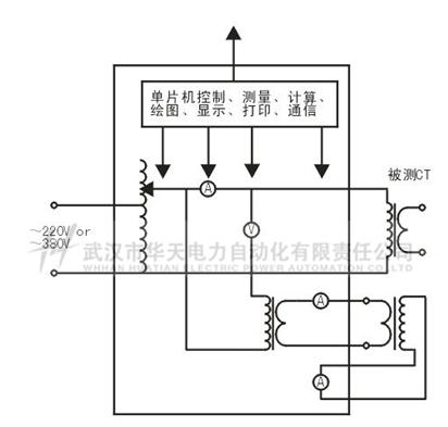 微处理器控制的全自动型测试装置。内置步进电机控制的全自动升压器产生电压,自动测量、描绘伏安特性曲线,计算10%误差曲线;内置自动升流器测量CT变比、极性。测试原理见下图。